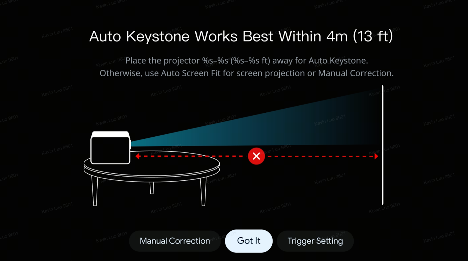 24. Improved Auto Keystone Distance Prompt: The warning message displayed when the projector is too far for Auto Keystone has been rephrased for clearer guidance on optimal placement and alternative correction methods