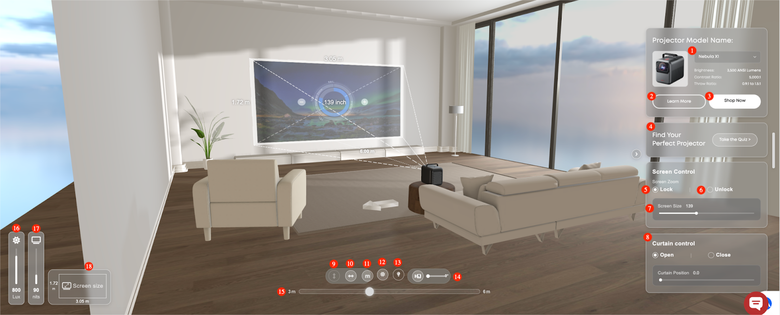 Curtain Control: You can open or close the curtain, adjust its position, and customize the range of the curtain covering the window. Through this function, preview the projection effects under different ambient light conditions (such as bright or dim).